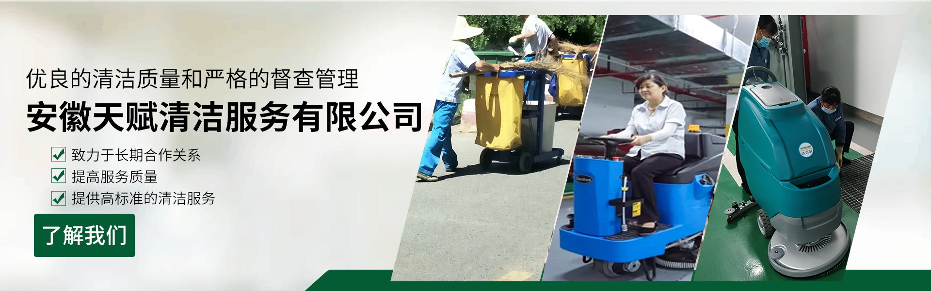 安徽天賦清潔服務有限公司是的服務型企業(yè),主要從事道路清潔、物業(yè)托管保潔、工程開荒、高空作業(yè)、地毯清洗、石材翻新等多項服務為一體的環(huán)保型清潔公司。公司管理機制完善,清潔作業(yè)經驗豐富,擁有技術力量,嚴格實行崗前培訓—崗中督查—上崗在培訓的員工管理措施,憑著優(yōu)良的清潔質量和嚴格的督查管理,為眾多企事業(yè)單位、醫(yī)院、酒店、廠區(qū)商場、物業(yè)、道路、學校、公園等提供后勤清潔服務。在業(yè)內擁有良好的口碑。工作人員,服務態(tài)度優(yōu),竭力為客戶提供好的保潔服務。安徽天賦清潔服務有限公司:致力于長期合作關系,提高服務質量,提供高標準的清潔服務。公司的經營理念:為營造一個更清潔、亮麗的生活和工作環(huán)境而努力!“誠信”是公司成功保證。“客戶至上,信譽為首”是公司宗旨。高標準提供服務,維護客戶利益、形象,是我始終不渝的目標。